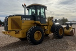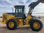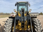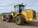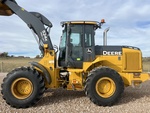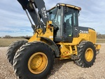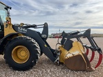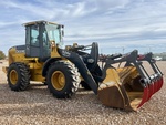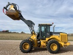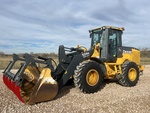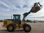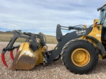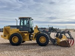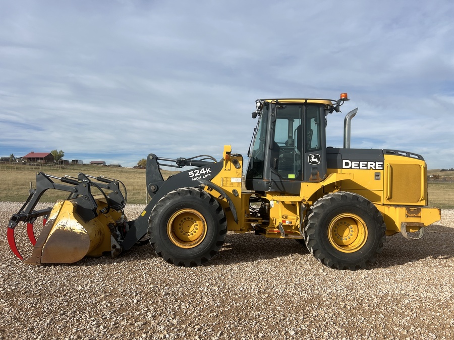 2015 Deere 524K high-lift wheel loader, only 2695 hours, new HD 5-tine industrial grapple, new bucket, joystick, factory auxiliary 3rd function, factory quick attach, cab, air, heat, ride control, dual diff lock, very solid, tight, original loader. Bale spears, pallet forks and multiple different buckets available.