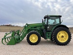 2014 John Deere 6170R, MFWD, 170hp, 4305 hours, 16 speed power quad with LH reverser, John Deere H360 SL loader, bucket, 5-tine grapple, joystick with 3rd function thumb control, 3pt, 3 remotes, 540/1000 pto, buddy seat, premium cab, good radial rubber, NO DEF, nice tractor right off the farm.