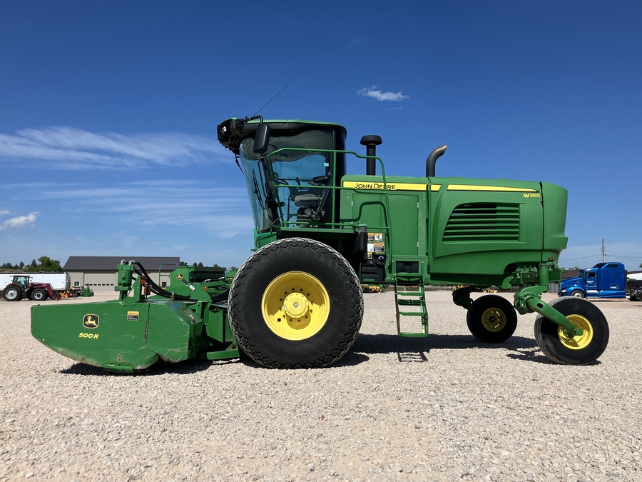 2015 John Deere W260 windrower with JD 16' 500R rotary header, 3118/2110 hours, Tri-lobe steel conditioners, new cutter bar, good machine.