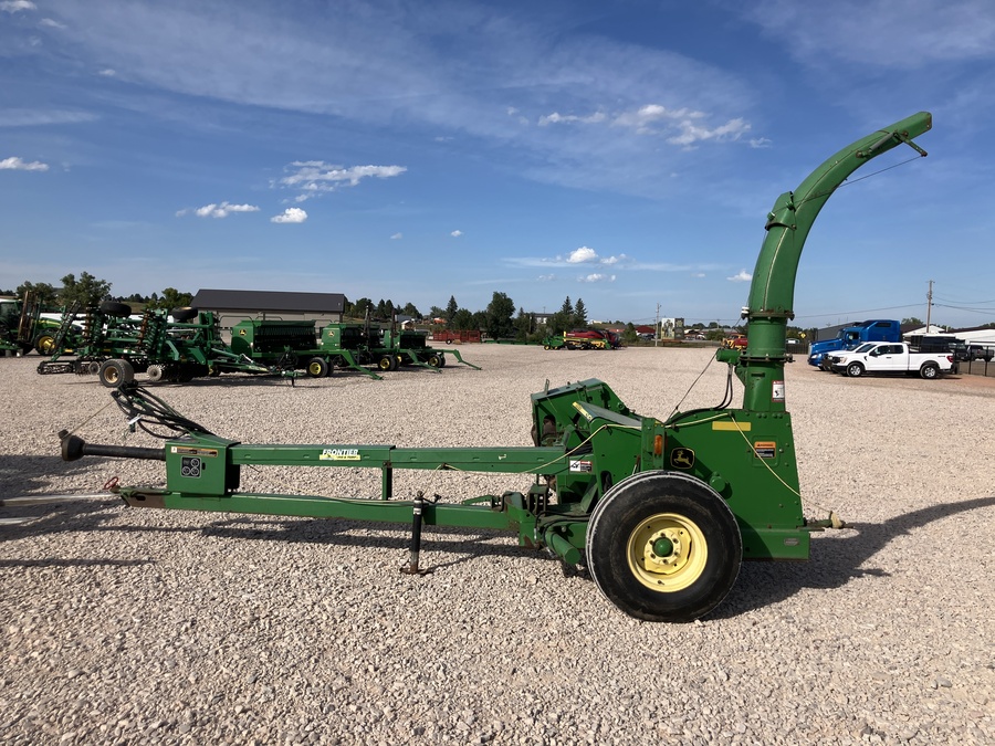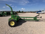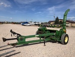 John Deere 3955 pull-type forage harvester with PU head and 2-row corn head, hydraulic tongue, hydraulic spout, control box.