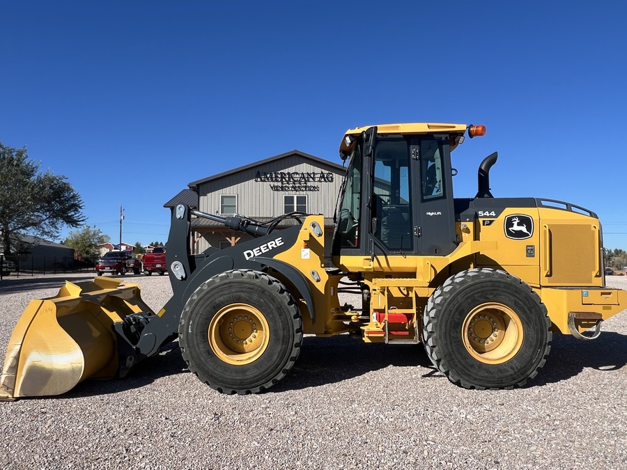2022 Deere 544P high-lift wheel loader, only 755 hours, warranty, w/Big Baer Fang 5, ultra heavy duty USA made 5-tine grapple, JRB quick attach, joystick with thumb control, like new machine, Immaculate!