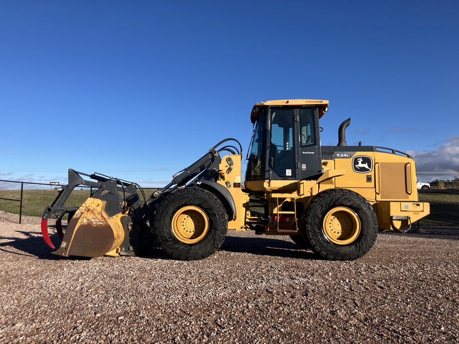 2019 Deere 524L wheel loader, only 5200 hours, Tool Carrier, new heavy duty 5 tine grapple, joystick with factory thumb control 3rd function, factory hydraulic quick attach, cab, air, heat, new rubber all around, nice loader.