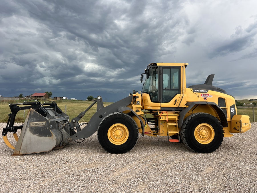 2016 Volvo L50H wheel loader, 7990 hours, 5 tine grapple, joystick controls, 3rd function, quick attach, fenders, Load-Rite onboard scale, air ride seat, back-up camera, good rubber, nice loader!
