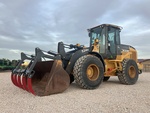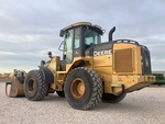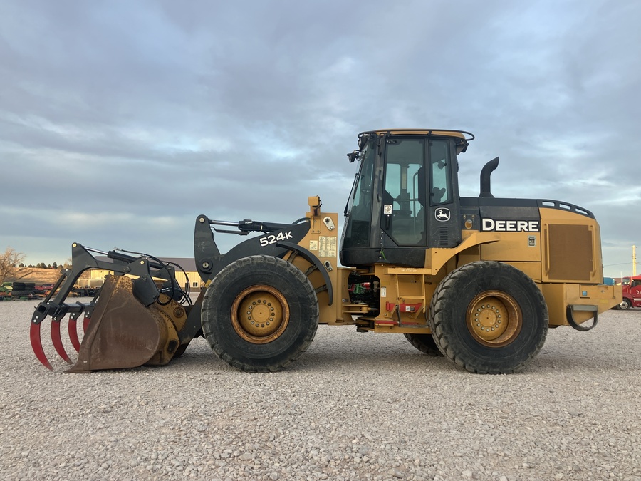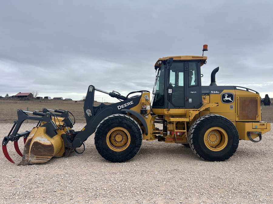 2016 Deere 524K wheel loader, 5570 hours, HD 5-tine grapple, joystick controls, aftermarket 3rd function, A/C, heat, air ride seat, diff lock, ride control, fender kit, good solid sound loader, low hour, very nice rubber.
