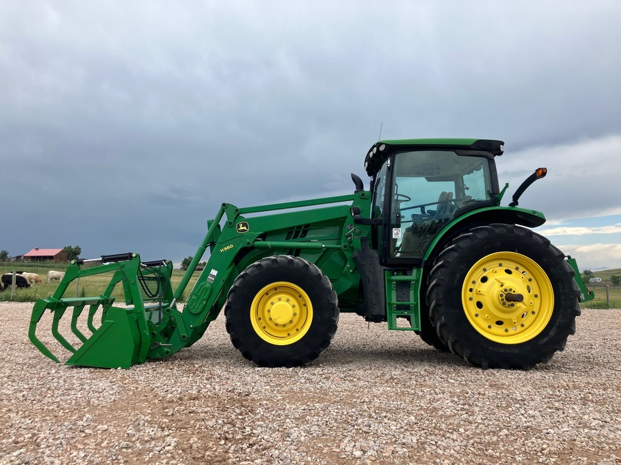 2014 John Deere 6170R, MFWD, 170hp, 4305 hours, 16 speed power quad with LH reverser, John Deere H360 SL loader, bucket, 5-tine grapple, joystick with 3rd function thumb control, 3pt, 3 remotes, 540/1000 pto, buddy seat, premium cab, good radial rubber, NO DEF, nice tractor right off the farm.