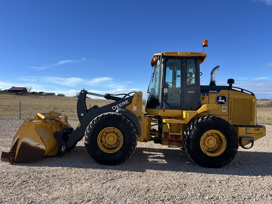 2020 Deere 444L high-lift wheel loader, 2285 hours, hydraulic quick attach, factory 3rd function thumb control on joystick controls, cab, air, heat, ride control, very nice loader.