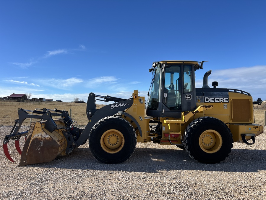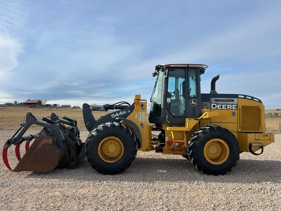 2018 Deere 544K-II wheel loader, 5551 hours, with new HD 5-tine grapple, joystick controls with 3rd function, hydraulic quick attach, air ride seat, front fenders, A/C and heat, new rubber all around, excellent loader.