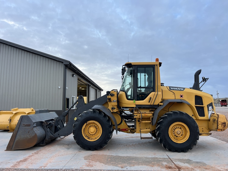 2014 Volvo L70G high-lift wheel loader with HD grapple, 14,949 hours, quick attach, 3rd and 4th function, 14' reach to pins, new traction rubber all around, emissions delete, clean loader for the hours.
