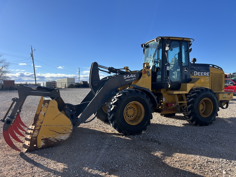 2016 Deere 544K High-Lift wheel loader, 13,825 hours, HD 5-tine grapple, joystick, factory 3rd function, Hi-Vis Deere hydraulic quick attach, A/C, heat, rear diff lock, ride control, new traction rubber all around, good machine checks out sound.