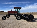 2014 Massey Ferguson WR9740 self propelled windrower, 1128 engine hours, with MF 16' sickle head, twin conditioners, cab, air, heat, hydraulic header tilt, 2 speed hydrostatic transmission, recent new guards, sickles, skid shoes and slip clutches, nice Nebraska machine.