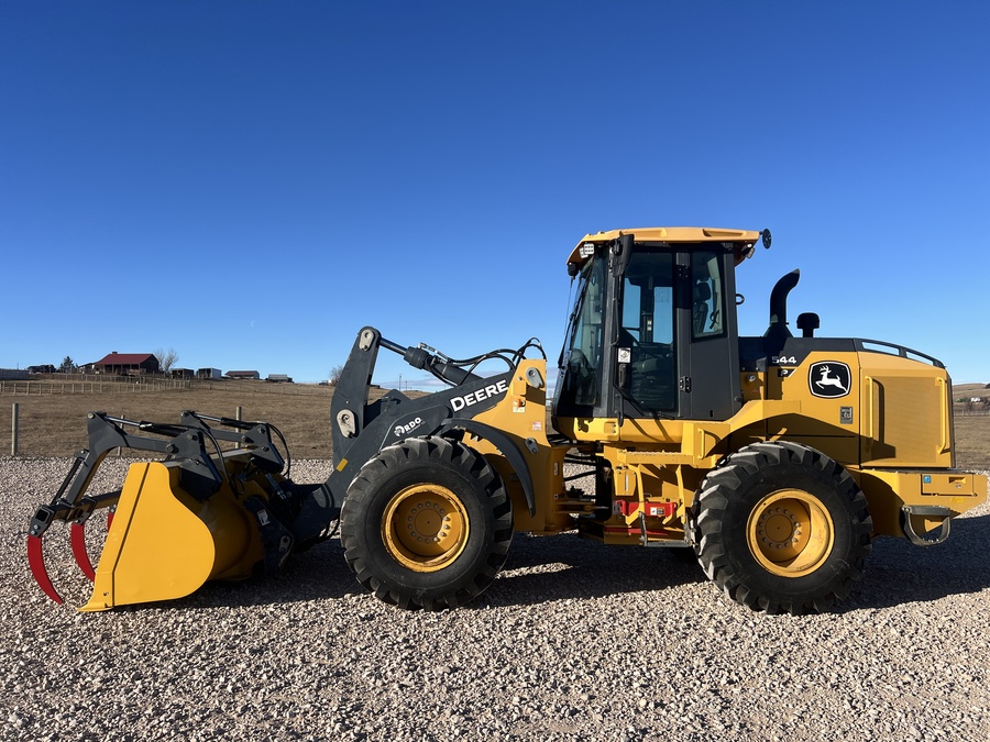 2023 Deere 644P wheel loader, 1245 hours, HD grapple, joystick with 3rd function thumb control, HI-Vis Deere hydraulic quick attach, diff lock, ride control, heated seat, heated mirrors, winter package, radial rubber, 5000 hr/700 day Deere factory warranty. Beautiful high-end machine!