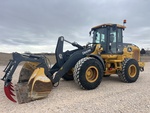 2019 Deere 524L wheel loader, 8975 hours, 5 speed PS transmission, heavy duty 5 tine grapple, joystick with aftermarket 3rd function, hydraulic quick attach, premium cab, rear camera, manual diff lock, fenders. *STOCK PHOTO