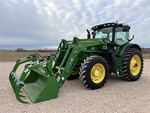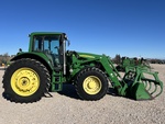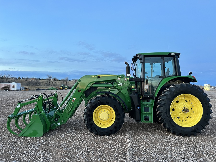 2023 John Deere 6155M, MFWD, 155hp, 615 hours, 20 speed power quad with LH reverser, John Deere 640R loader, bucket, grapple, joystick with thumb control, 3pt, 540/1000 pto, 3 remotes, front fenders, emissions warranty to 10-5-28, like new!