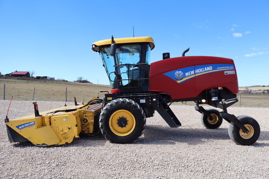 2015 New Holland SR220 windrower with New Holland 416 Durabine 16' rotary header, 1310/1107 hours, cab, air, heat, rubber conditioners, good North Dakota trade-in straight off the farm.
