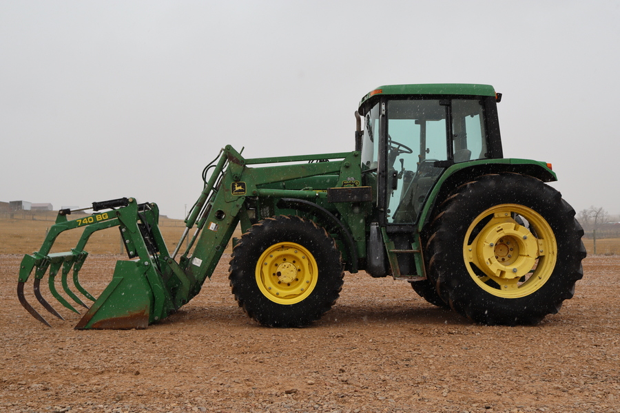 1998 John Deere 6410 MFWD, 110hp, 7608 hours, 16 speed power quad with LH reverser, John Deere 640 SL loader, bucket, grapple, joystick, 3pt, 540/1000 pto, 2 remotes, front fenders, rear weights, good rubber.