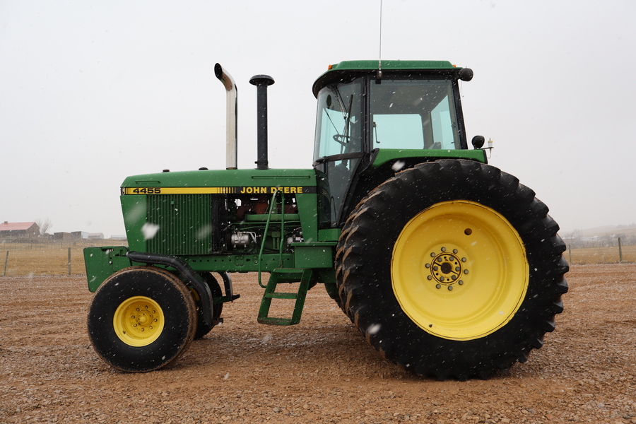 1987 JD 4250 MFWD, 15 spd PS, Buhler Allied Loader, bucket, grapple, joystick, 7472 hrs showing, 2 remotes, 540/1000 pto, 3 pt., 20.8-38 rears, good rubber all-around, South Dakota trade-in.