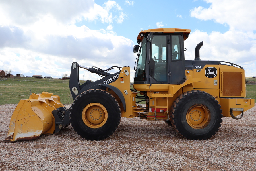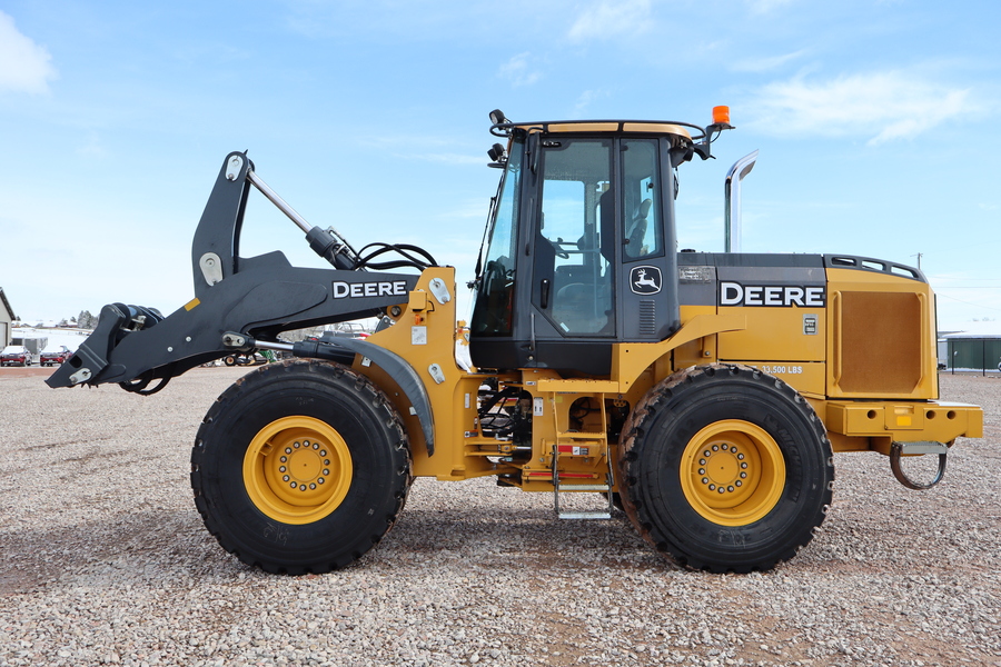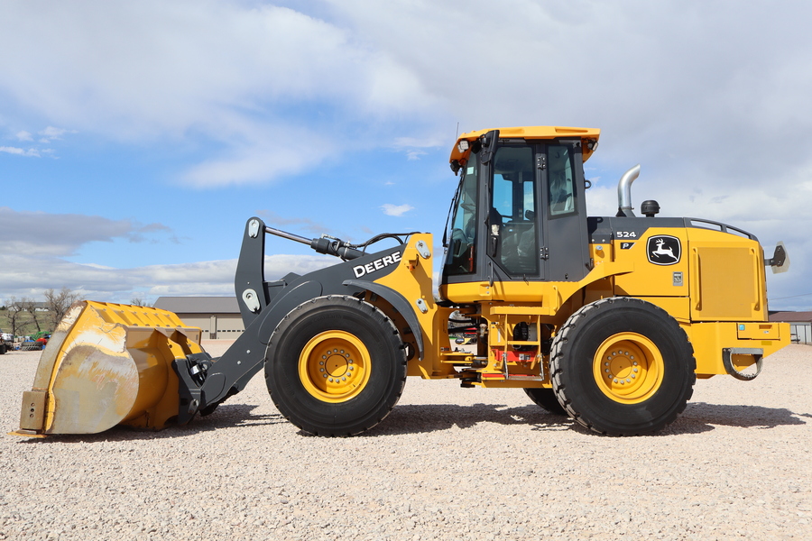 2024 Deere 524P High-Lift wheel loader, 4335 hours, joystick control, hydraulic quick attach, fenders, zero rust, excellent paint, excellent interior, absolutely beautiful, well cared for loader! HD grapple, bale forks and pallet forks also available.