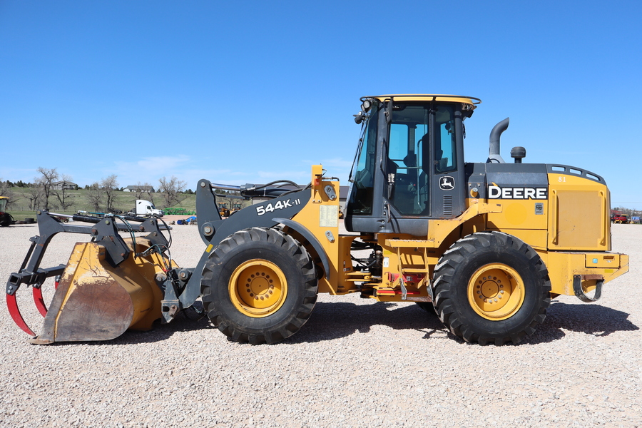 2011 Deere 544K wheel loader with HD grapple, 10,822 hours, JRB hydraulic quick attach, aftermarket 3rd function on joystick, cab, air, heat, front fenders, good rubber, pre-emissions.