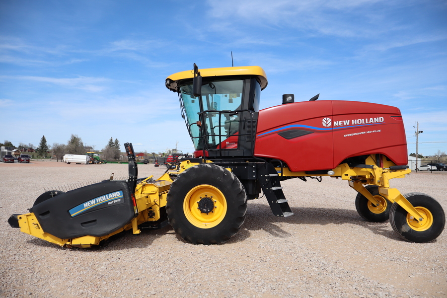 2023 New Holland SR160 Plus windrower with NH HS 16' sickle header, 1068 hours, rubber conditioners, cab, air, heat, nice machine!